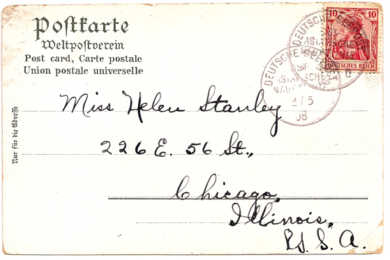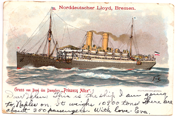 Dear Helen: This is the ship I am going to Naples on. It weighs 10900 tons. There are about 350 passengers. With love Eva.